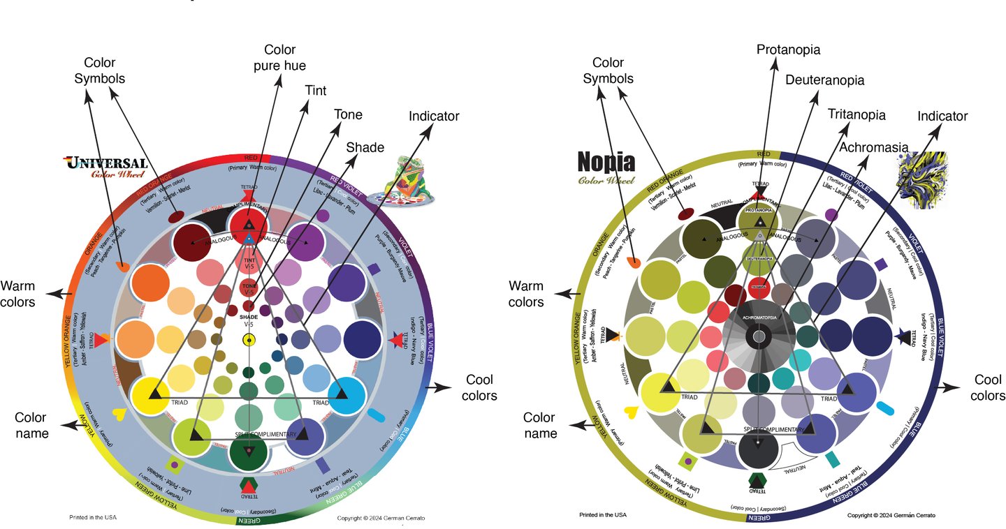 The Universal Color Wheel and the Nopia Color Blind Wheel are essential tools for understanding color relationships within color theory across different visual perceptions..