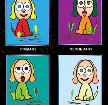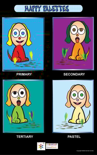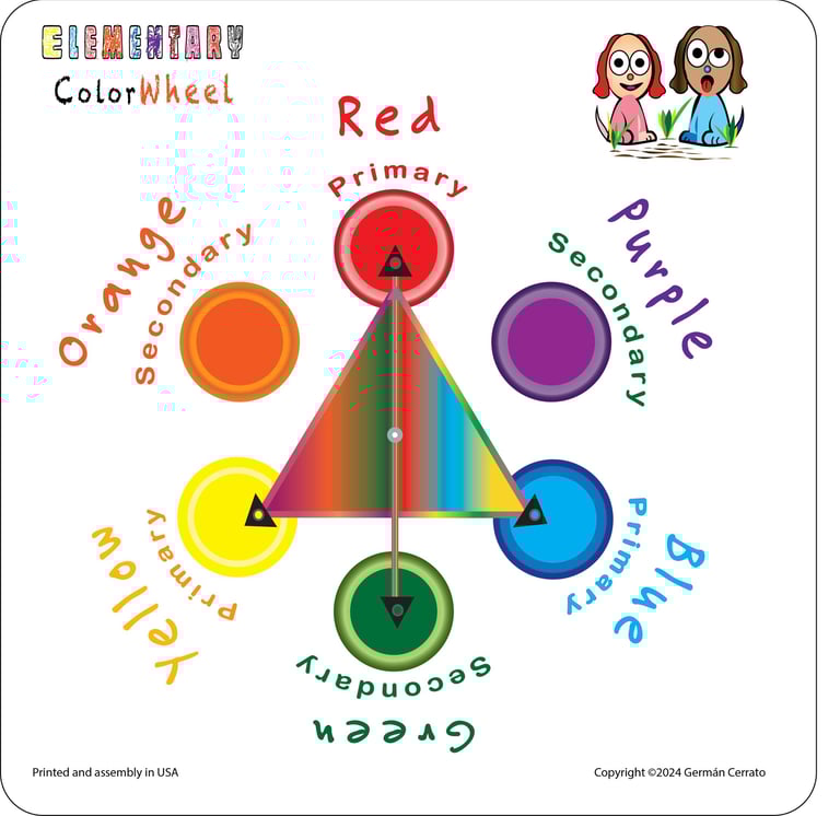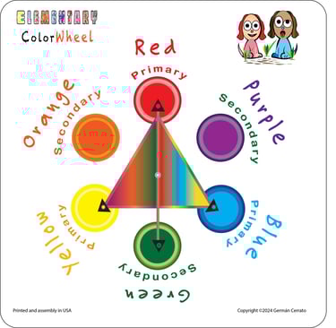 The Elementary Color Wheel (10 × 10 in) is offered in both magnetic and wall-mounted styles. It showcases primary and secondary colors arranged in a circular design, aimed at teaching young children fundamental color associations and complementary color schemes. Each color's outer stroke indicates a lighter shade of the same hue. Learn more.......