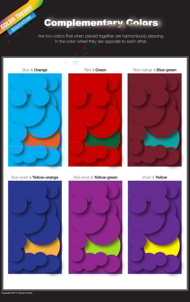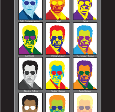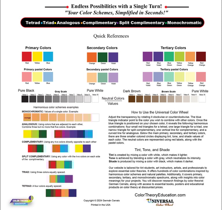 The reverse side presents primary, secondary, and tertiary colors, along with grayscale and brown-scale references. It also includes examples of harmonious color schemes, step-by-step usage instructions, and explanations on how to create tints, tones, and shades. Learn more.......