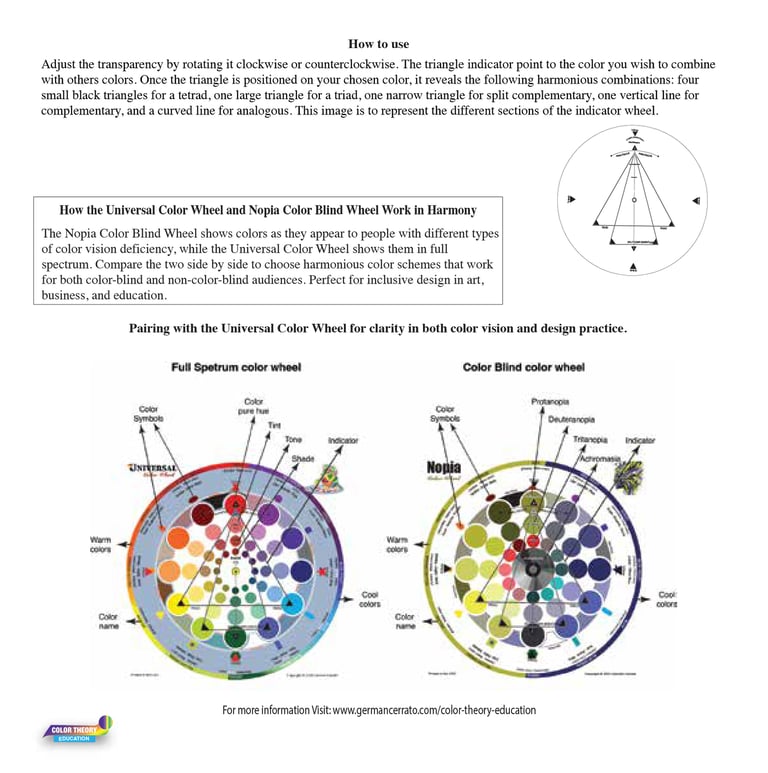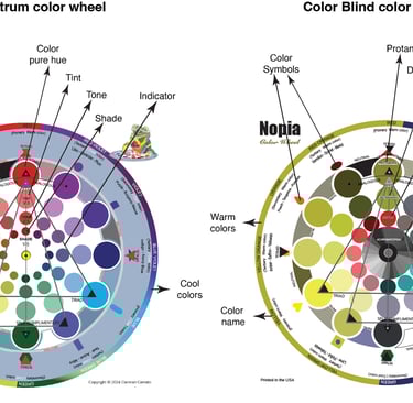 Nopia Color blind Wheel (6x6 in) designed specifically for Color Vision Deficiency (CVD). This tool is an essential addition to both designers and educators, empowering users to extend their reach and ensure accessibility for color-deficient audiences by providing ways colorblind individuals experience color persection. Learn more....